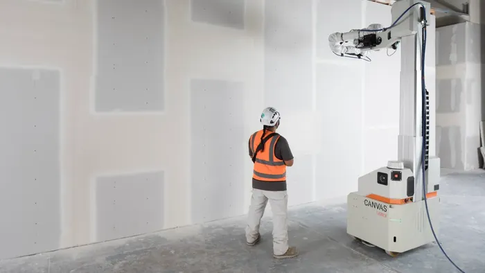 The machine measures 30 by 34.5 inches and weighs 1,200 pounds. It has all-wheel steering, runs a full workday on a single charge and can complete Level 4 and Level 5 finishes, according to Canvas. The company says its robots are easy to use and give workers in the drywall trade skills for the future while reducing fatigue, injuries and 70% of repetitive motions.